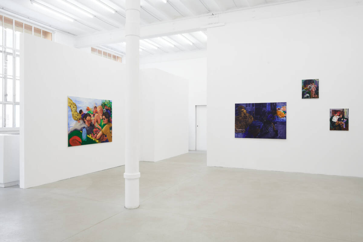 This approach makes the works vibrate, allows us to immerse ourselves in the relief of the impasto materiality, follow the brushstroke, catch our breath briefly on the glazed surfaces and then return to the vibrant colours. Finally, we take another step back to grasp what is depicted: what we see are painterly snapshots of intimate encounters or social interactions.
